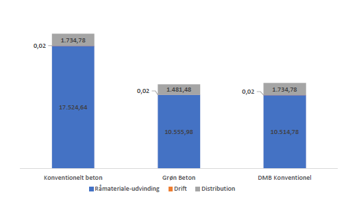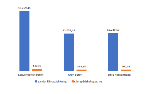 Miljøpåvirkningen er beregnet ud fra en blanding af konsekvens- og attributionalbaseret data, udtrukket fra EcoInvent og offentliggjort publikationer. EcoInvent-data er udtrukket fra version 3.7.1 og er beregnet ud fra LCIA-metoden IPCC 2013, GWP 100a, som er en vurderingsmetode der er udviklet af IPCC (Intergovernmental Panel on Climate Change). Vurderingsmetoden kigger udelukkende på klimabelastningen og omregner forskellige drivhusgasser til en kg CO2-ækvivalent (CO2-eq) over en tidsperiode på 100 år. Sammenligningen tager udgangspunkt i en opstrøms livscyklusvurdering, cradle-to-gate, hvor beregningerne inkluderer klimapåvirkningerne fra råmaterialeudvinding frem til betonen er leveret og påbegyndt støbning. Dermed er tørring/hærdning, brug, vedligeholdelse og senere bortskaffelse af betonen ekskluderet, da der ikke forventes at være en forskel mellem de tre produkter. Datagrundlaget bygger på cradle-to-gate værdier fra ecoinvent og offentligt tilgængelige EPD’er.