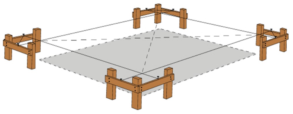 Når galgerne er anbragt, anbringes søm i hvert bræt således, at den flugtsnor, der bindes til sømmene, danner fundamentets ydre omrids.