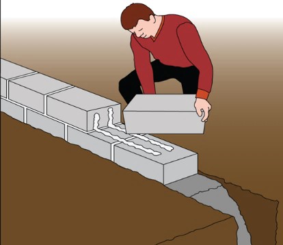 Fundablokke opstilles som regel i den bløde beton og vrikkes på plads i betonen. En smule afvigelse fra det vandrette plan betyder ikke så meget, når bare muren er nøjagtig i lod og retningen er holdt. Når blokkene er opstillet og udstøbt, skal der mangle ca. 48 cm i, at blokkens overkant er oppe i sokkelhøjde.